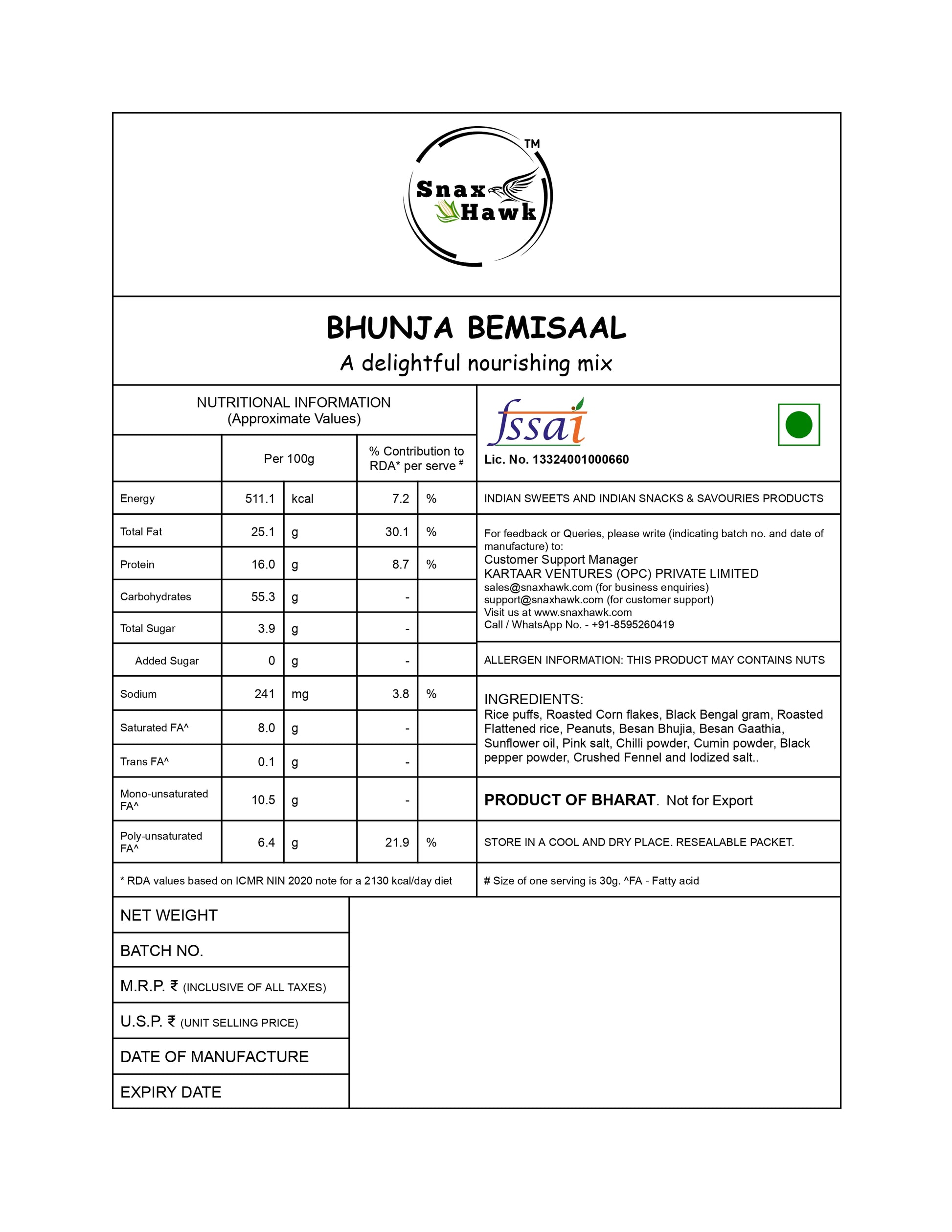 Rice puffs, Roasted Corn flakes, Black Bengal gram, Roasted Flattened rice, Peanuts, Besan Bhujia, Besan Gaathia, Sunflower oil, Pink salt, Chilli powder, Cumin powder, Black pepper powder, Crushed Fennel and Iodized salt.