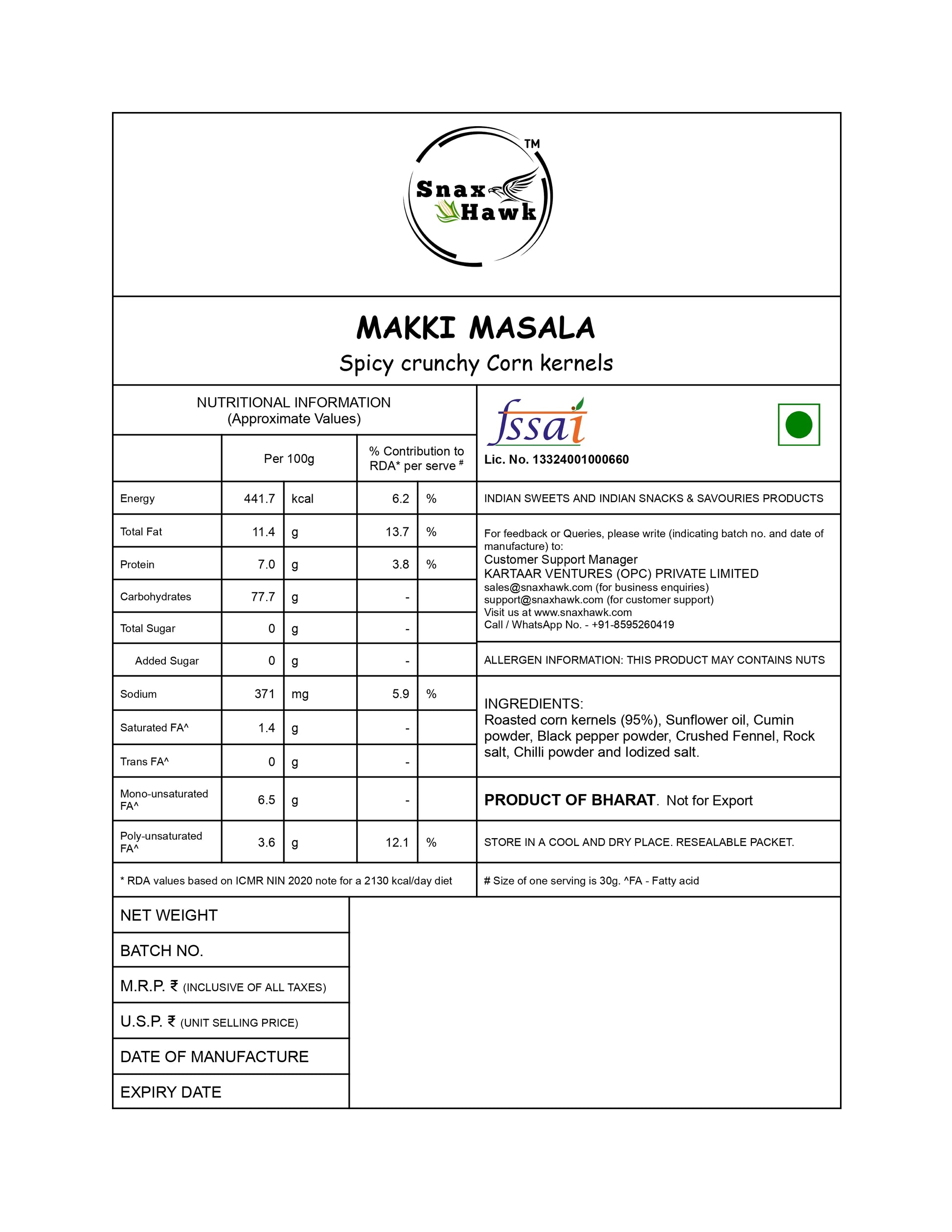 Roasted corn kernels (95%), Sunflower oil, Cumin powder, Black pepper powder, Crushed Fennel, Rock salt, Chilli powder and Iodized salt.