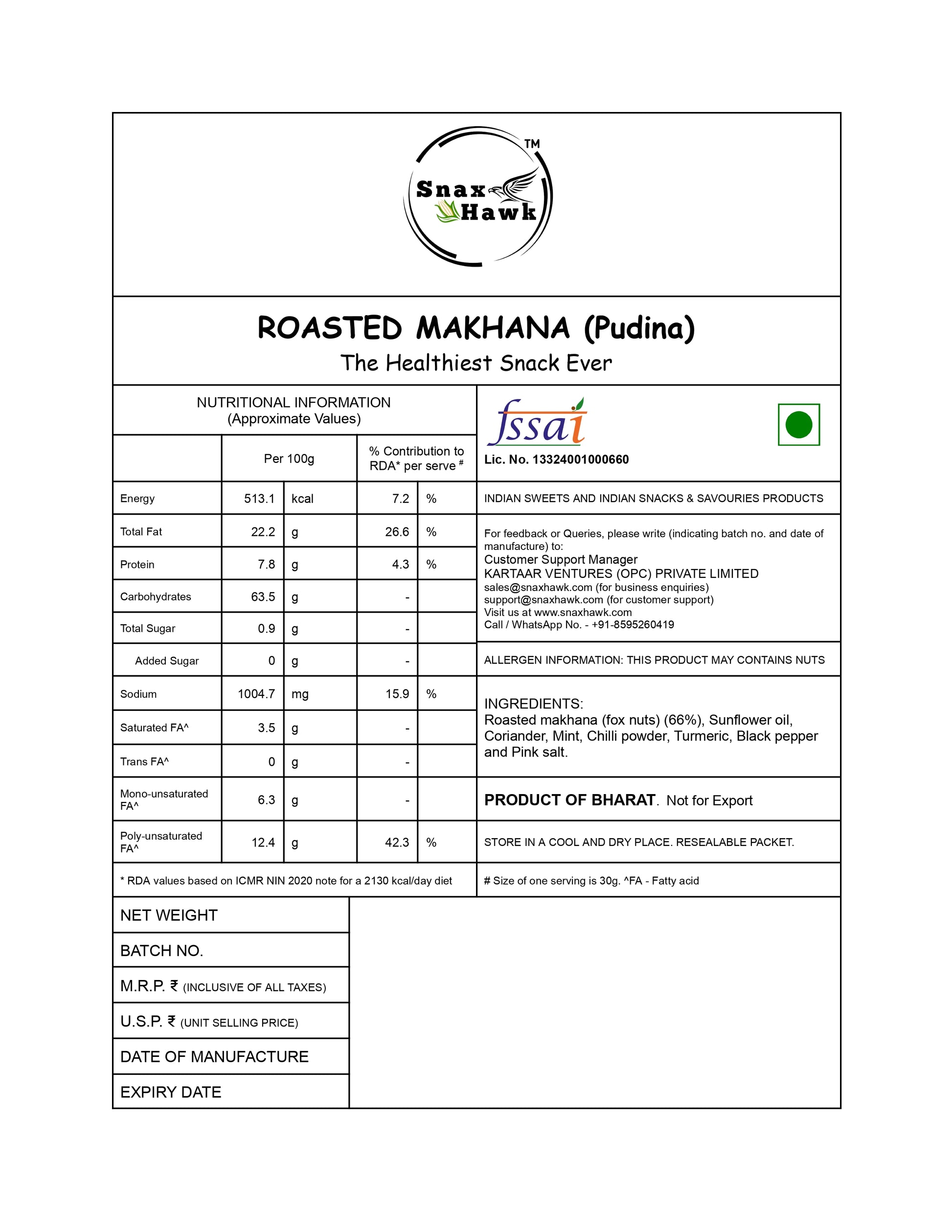 - Pudina Flavour: Roasted makhana (fox nuts) (66%), Sunflower oil, Coriander, Mint, Chilli powder, Turmeric, Black pepper and Pink salt.