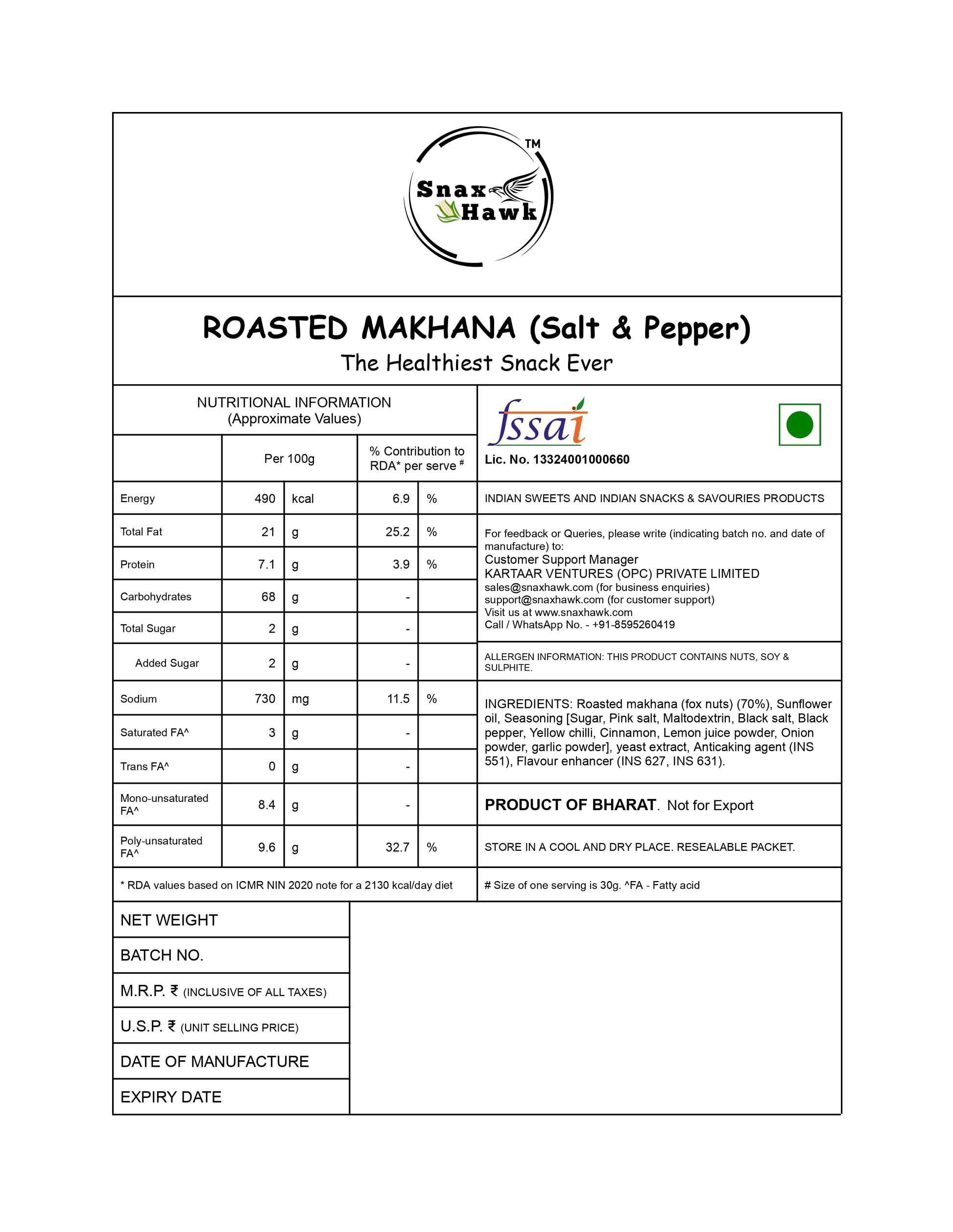 - Salt & Pepper Flavour: Roasted makhana (fox nuts) (70%), Sunflower oil, Seasoning [Sugar, Pink salt, Maltodextrin, Black salt, Black pepper, Yellow chilli, Cinnamon, Lemon juice powder, Onion powder, garlic powder], yeast extract, Anticaking agent (INS 551), Flavour enhancer (INS 627, INS 631).