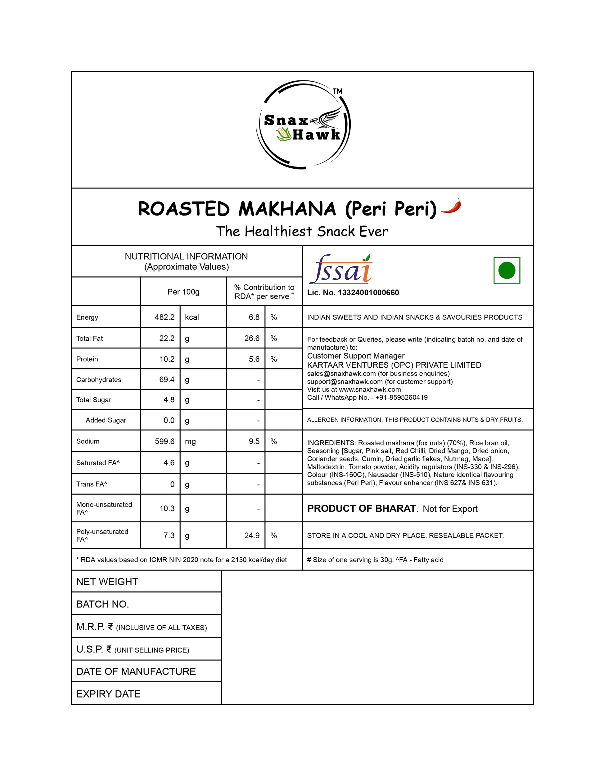 - Peri Peri Flavour: Roasted makhana (fox nuts) (70%), Rice bran oil, Seasoning [Sugar, Pink salt, Red Chilli, Dried Mango, Dried onion, Coriander seeds, Cumin, Dried garlic flakes, Nutmeg, Mace], Maltodextrin, Tomato powder, Acidity regulators (INS-330 & INS-296), Colour (INS-160C), Nausadar (INS-510), Nature identical flavouring substances (Peri Peri), Flavour enhancer (INS 627& INS 631).